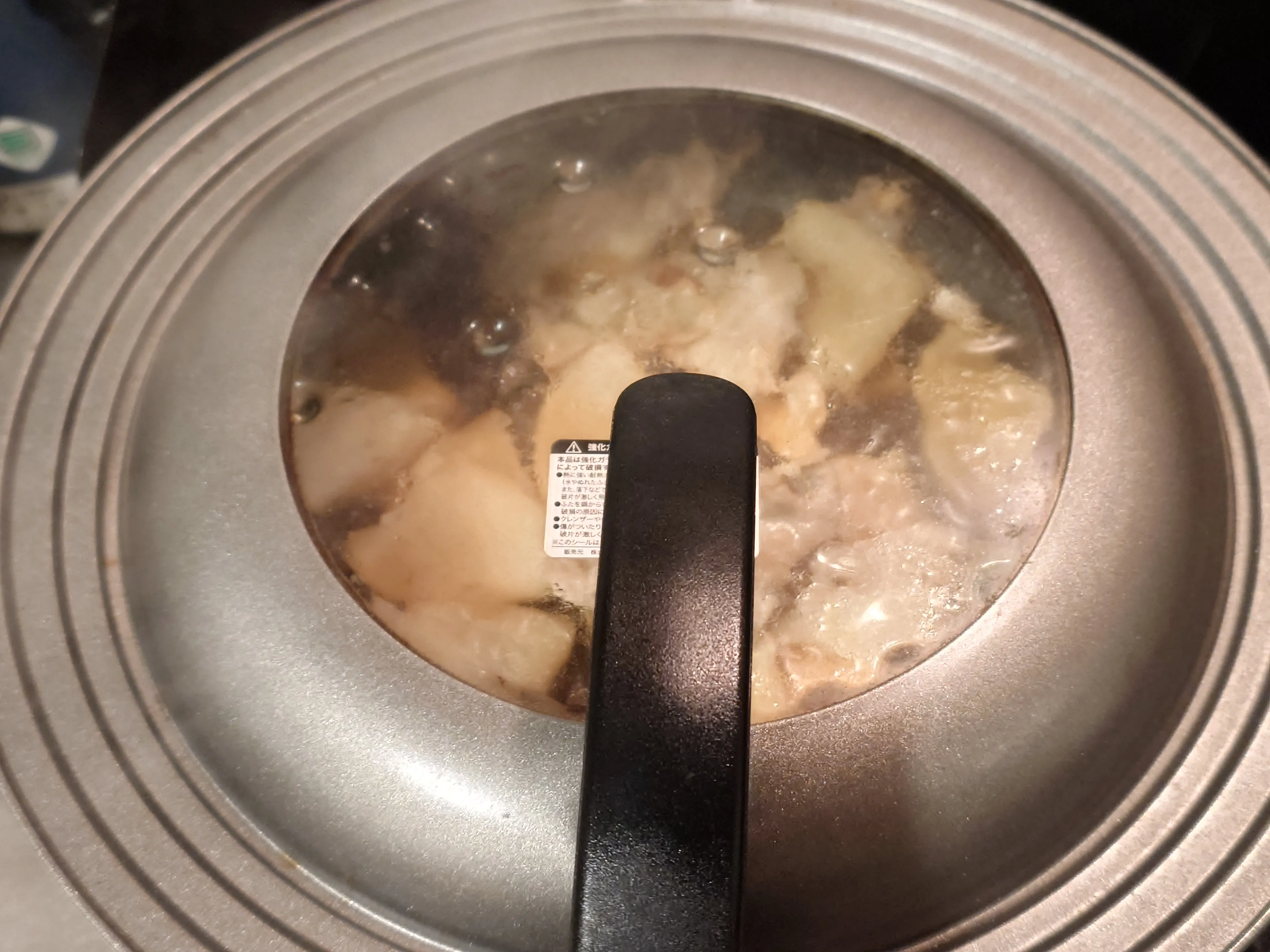 フライパンにしょうゆ、みりん、酒、砂糖、水を入れる。蓋をして5分間弱火で加熱する。