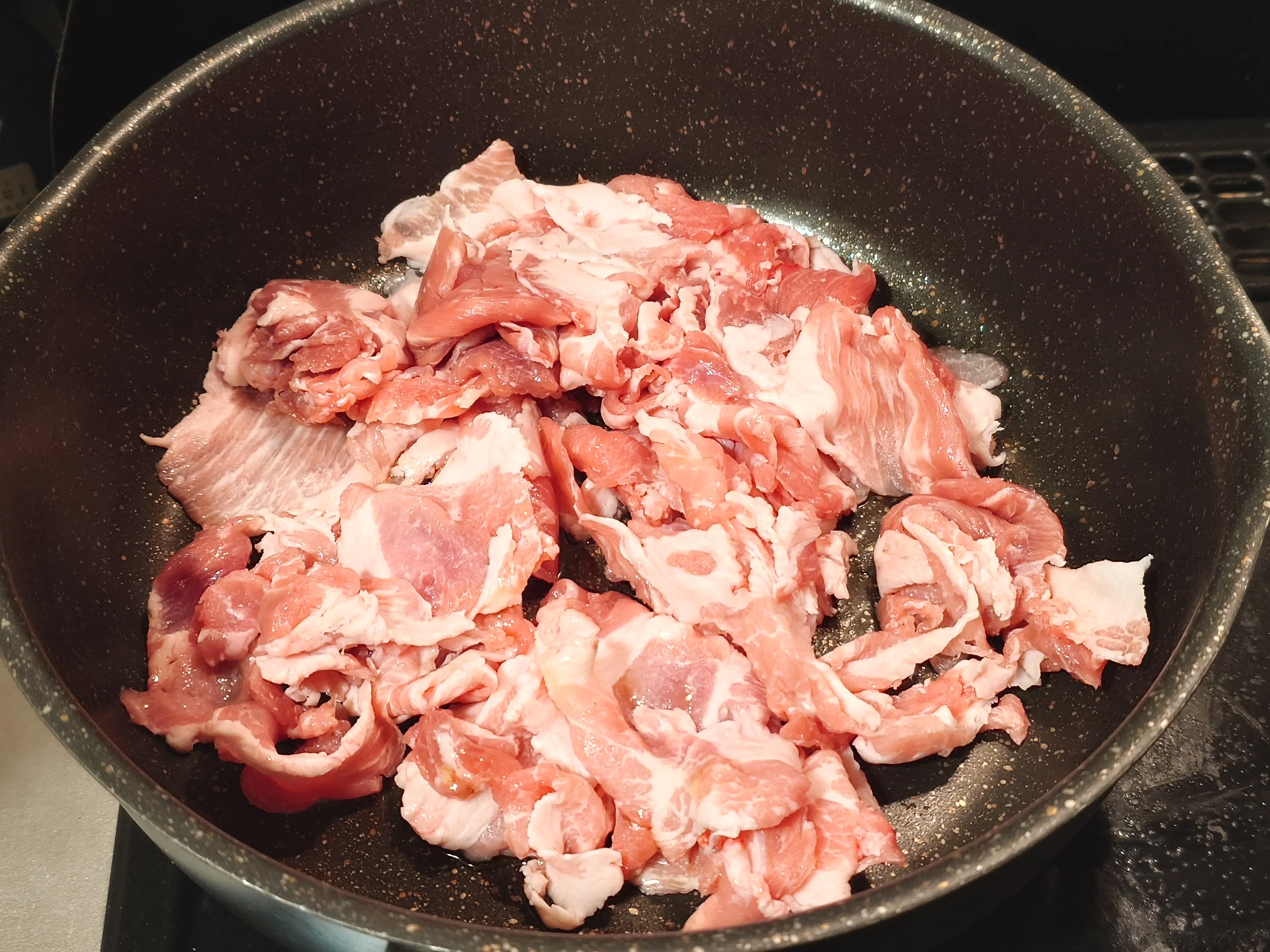 鍋にごま油を入れ、豚肉を中火で炒める。