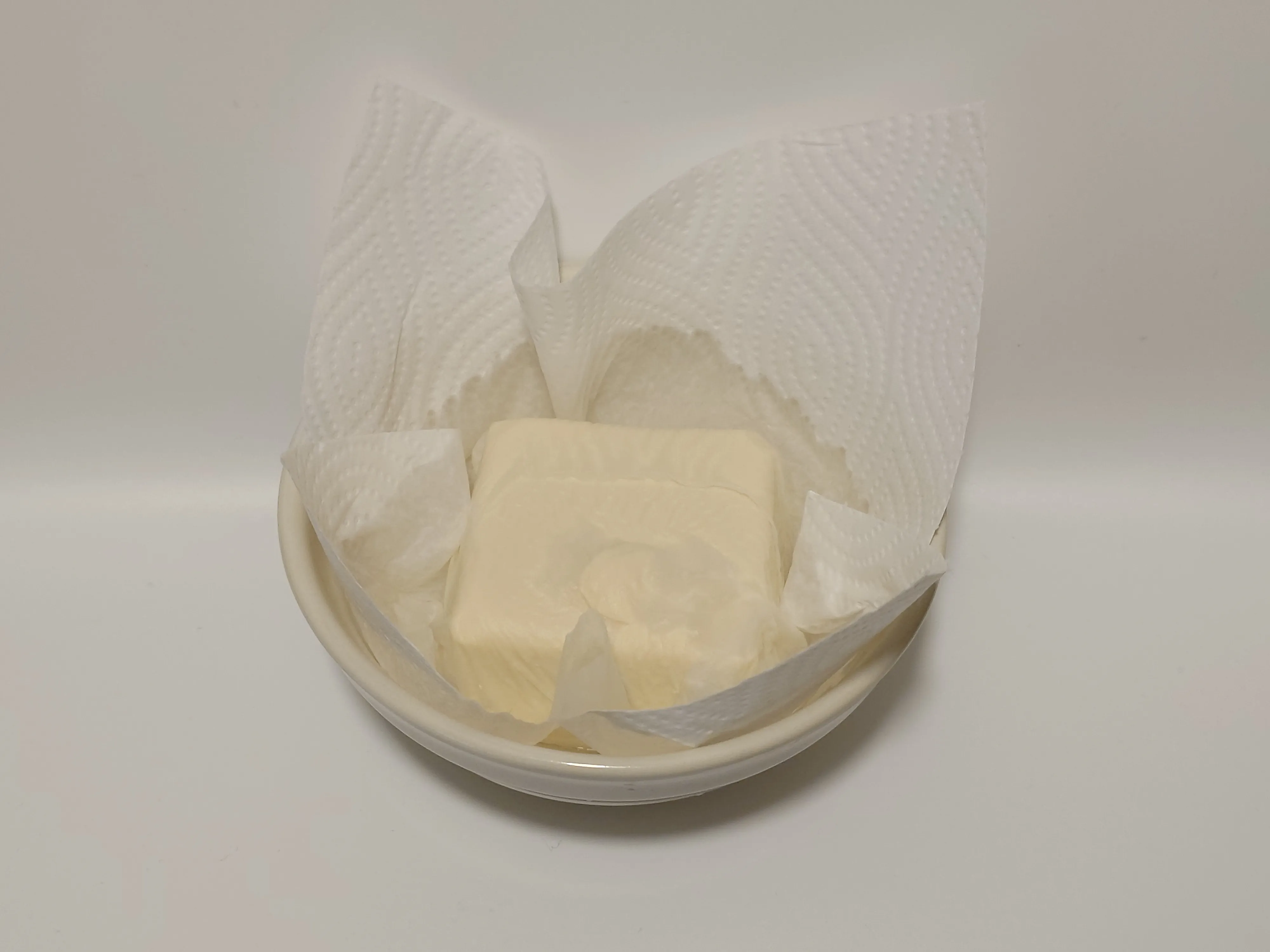 容器に豆腐を入れ、キッチンペーパーを上にかぶせレンジで1分半加熱する。