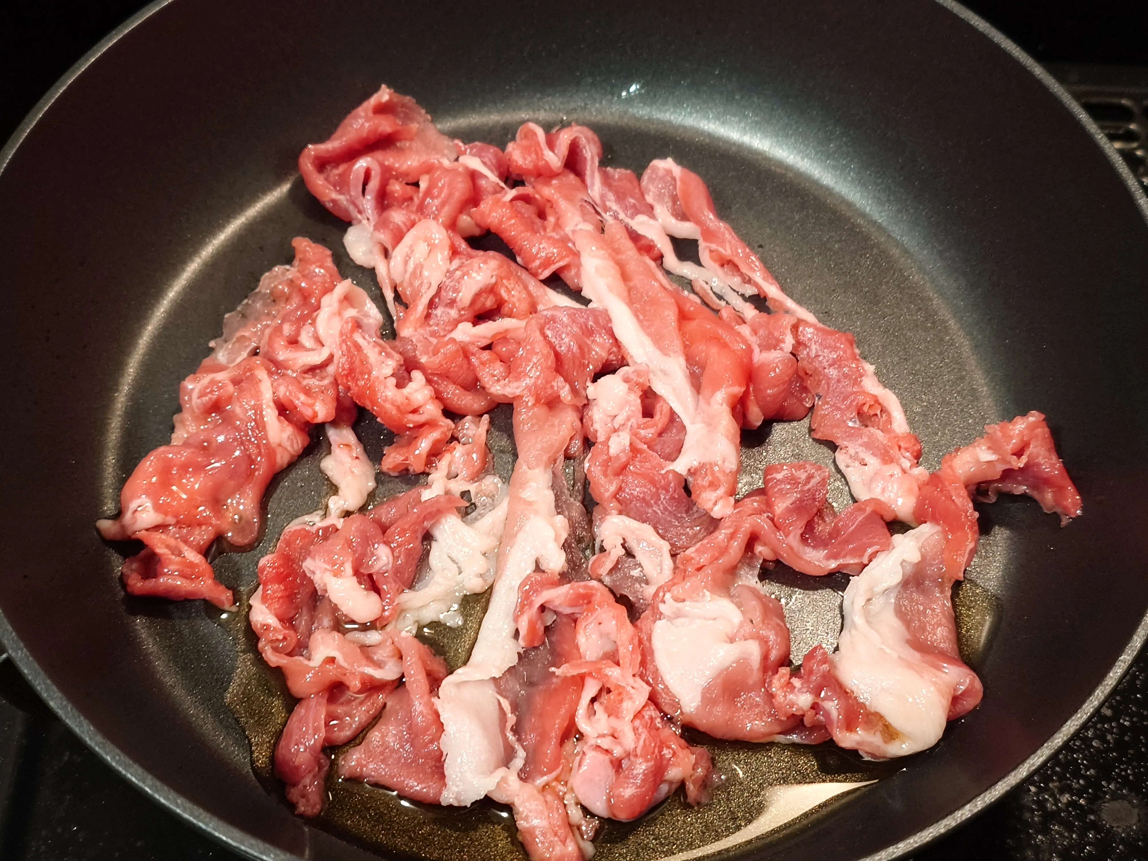 フライパンにごま油を入れ、豚肉を中火で炒める。