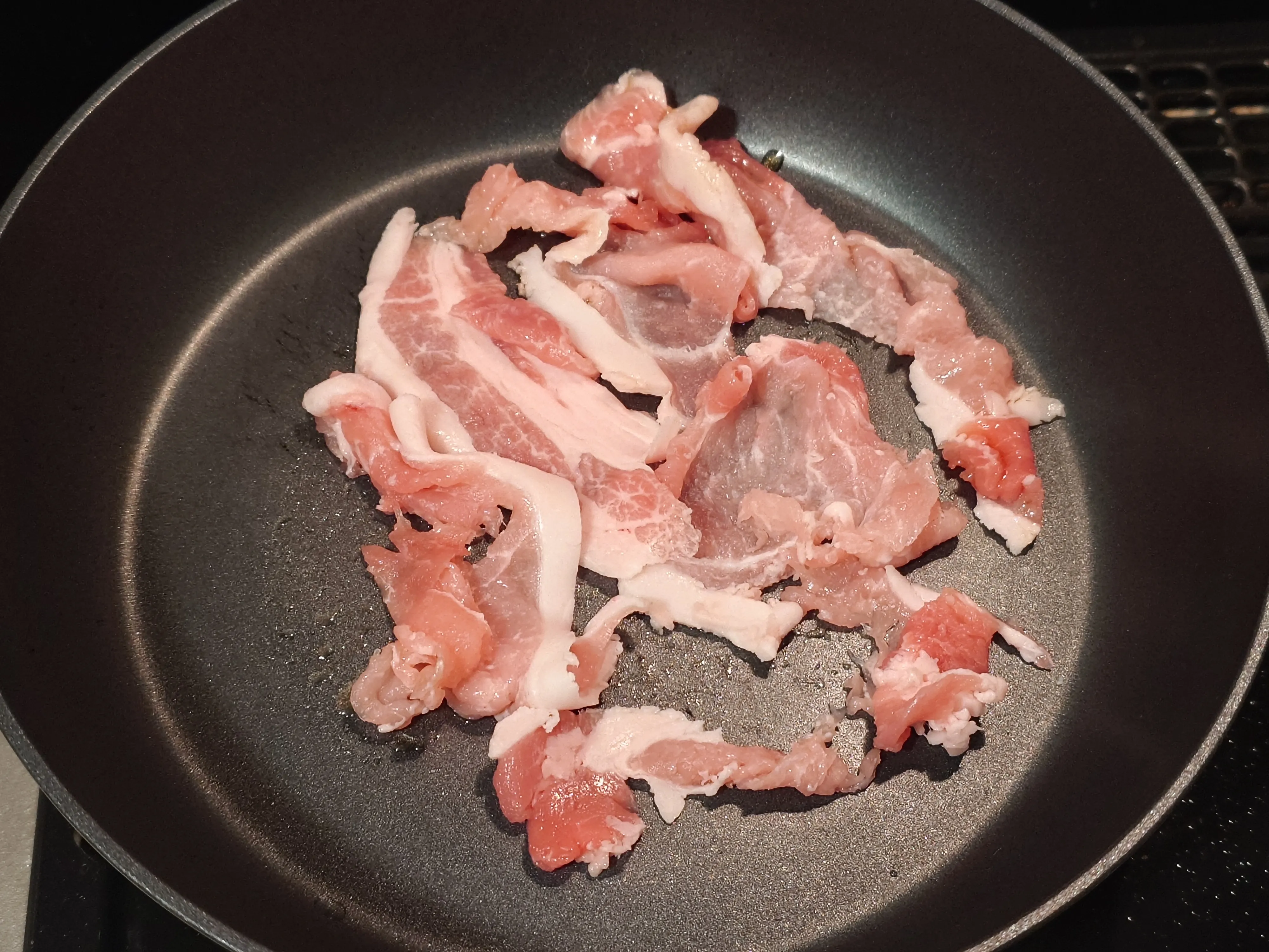 フライパンにごま油を入れ、豚肉を中火で炒める。