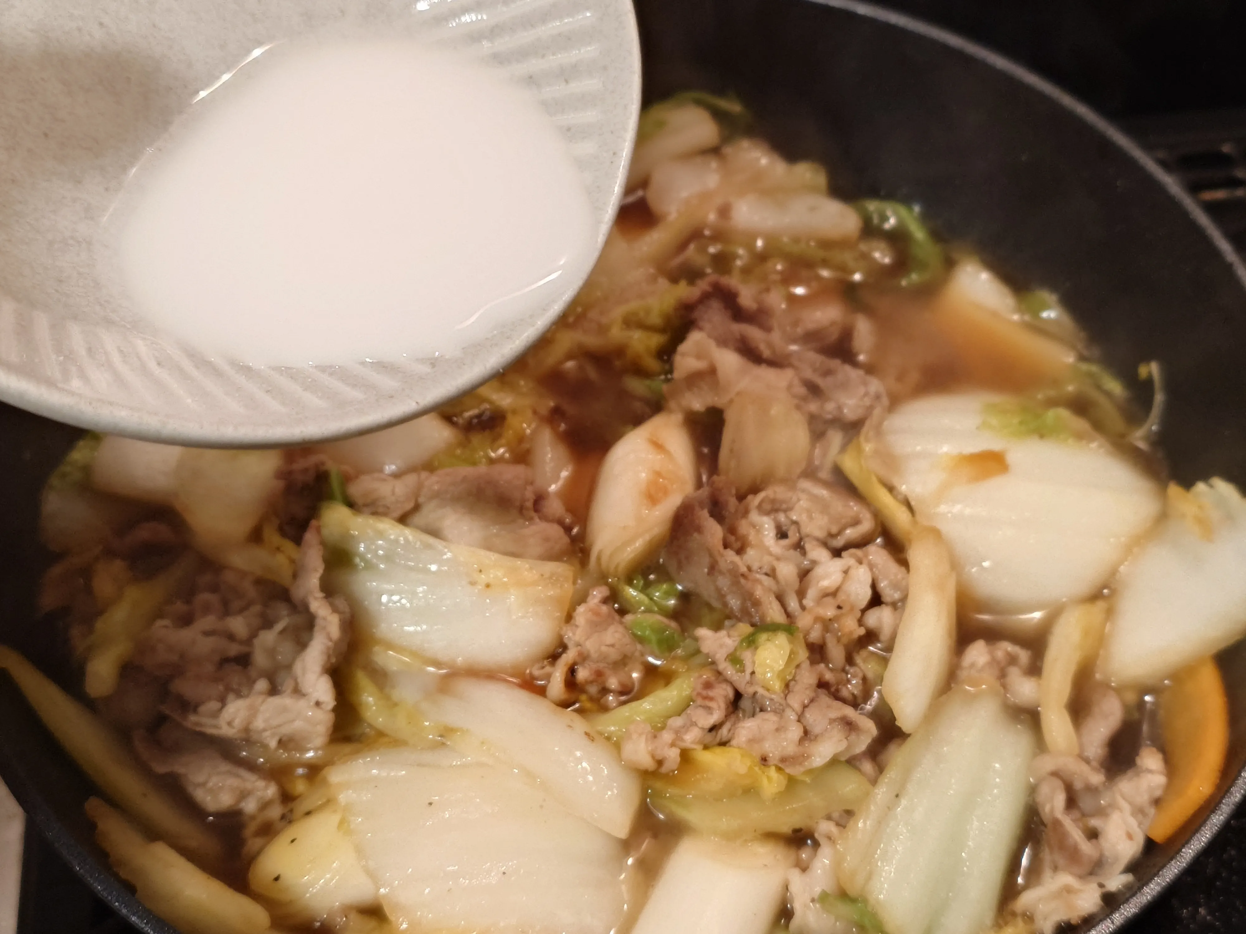 フライパンに片栗粉+水を加え、とろみがつくまで加熱する。